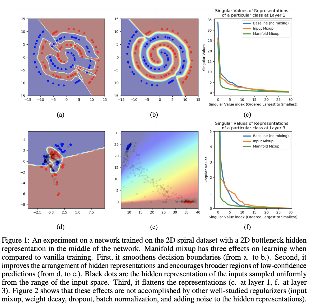논문에서는 이에 대한 해결책으로 간단한 regularizer이며 덜 confident하게 predict 할 수 있도록 하는 Manifold Mixup을 소개합니다.
