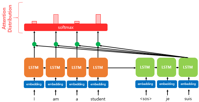 이렇게 각 벡터간의 내적을 통해 구한 값을 attention score라고 하고 이에 softmax 함수를 통해 attention distribution을 구합니다.