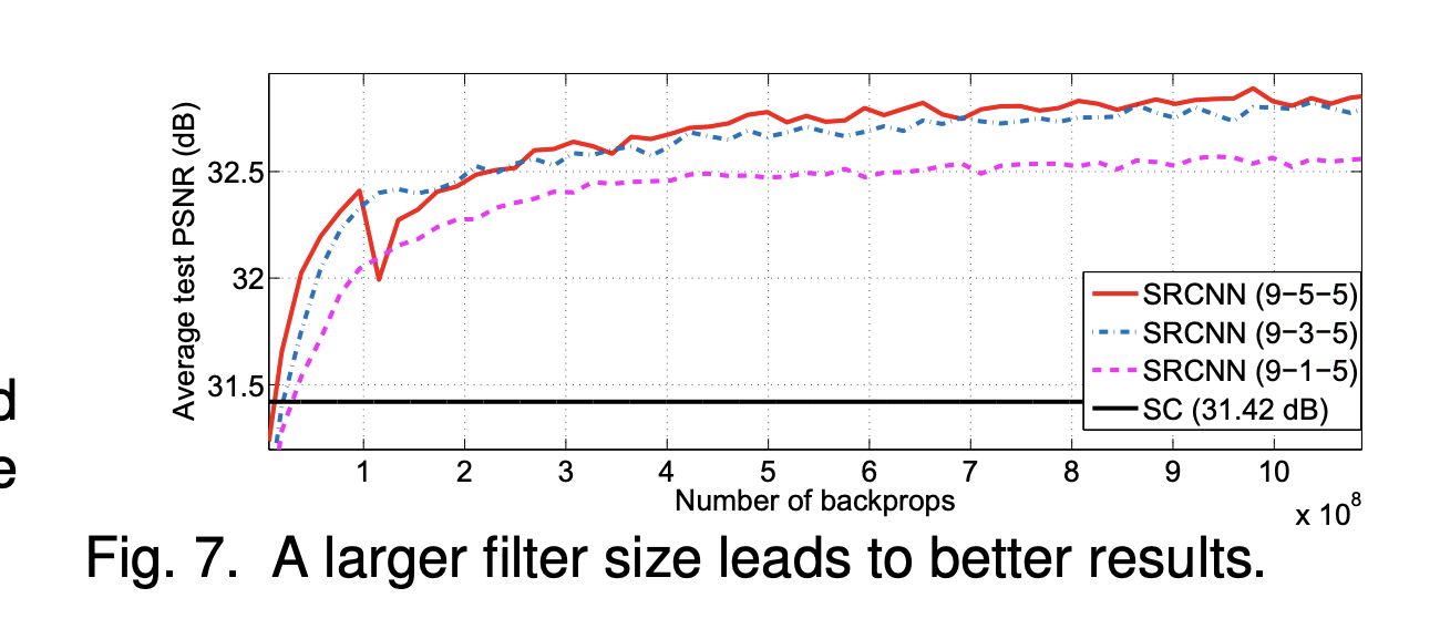 Fig. 4. Fig. 7.을 보시면 larger filter size, larger dataset이 더 좋은 성능을 이끌어 냄을 알 수 있습니다. 하지만 이만큼 걸리는 시간 및 계산해야 하는 양이 많아 지기 때문에 성능과 시간, 연산량에 trade-off 관계가 있다는 것을 알 수 있습니다.