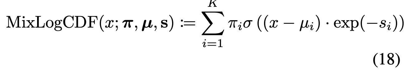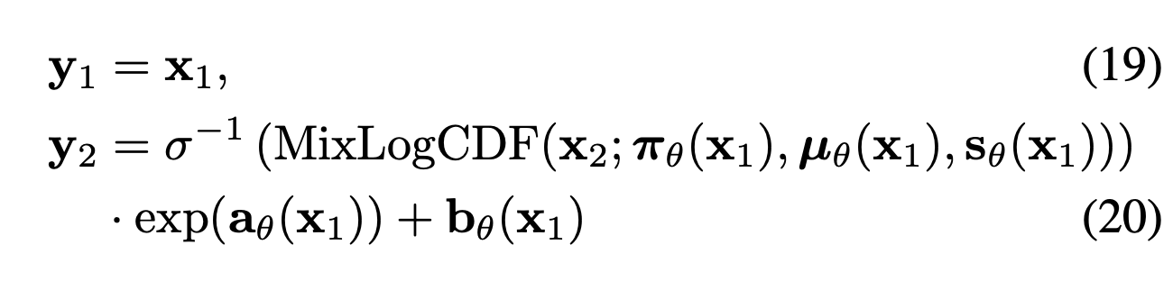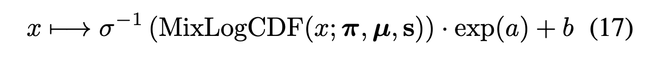 요점은 Continuous Mixture CDF를 사용하자는 것입니다. 실험적으로 여러 파라미터를 갖는 Logistic Mixture CDF를 사용했을 때 성능이 좋았다고 합니다. 그리고 CDF 형식이라서 값이 0에서 1 사이 값을 갖게 되는데, 여기에 inverse sigmoid를 붙여줘서 이 Coupling layer의 역이 무조건 존재하게 해줬습니다.