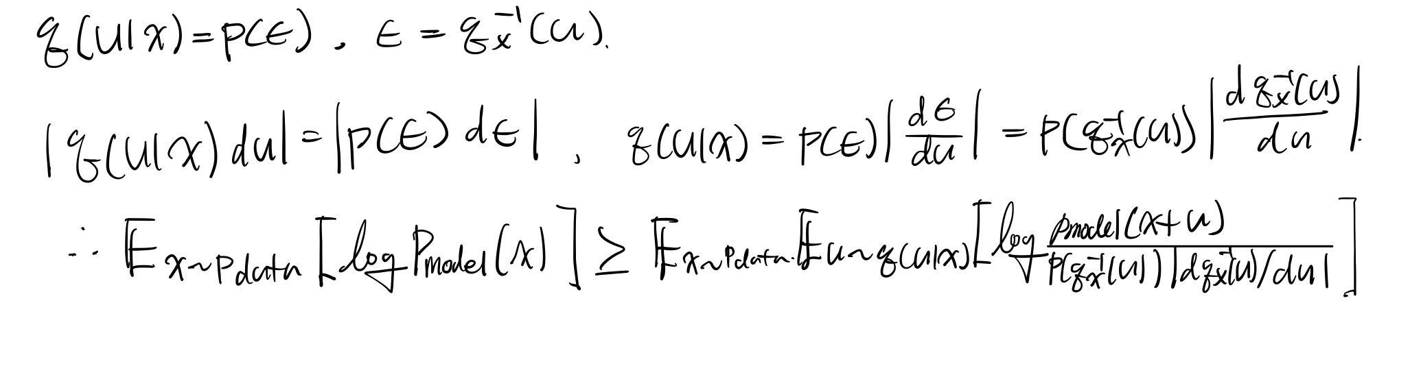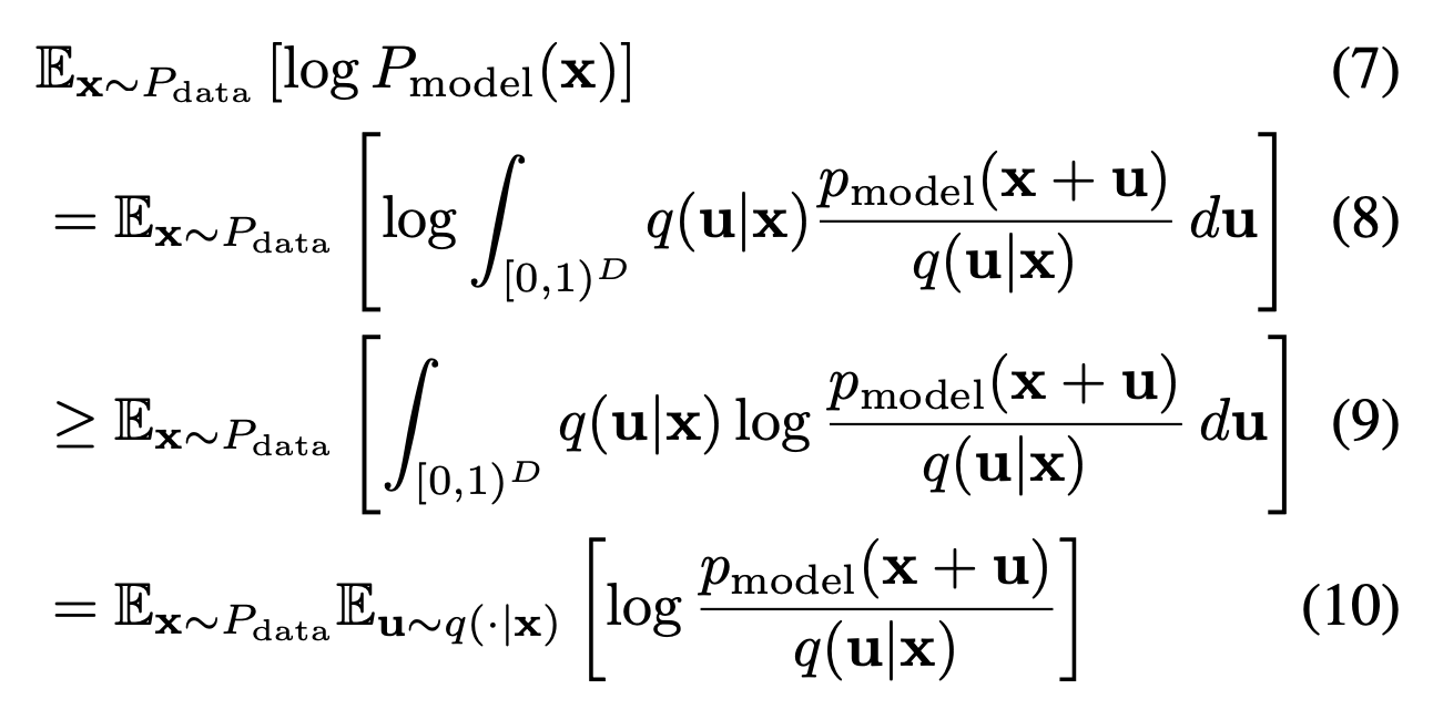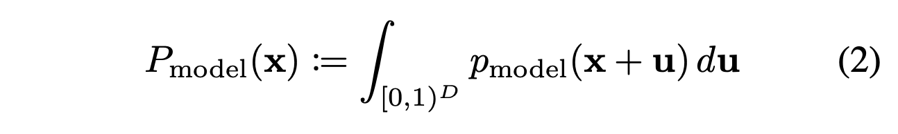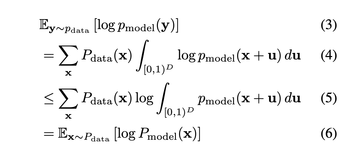 위의 식을 보면 단순히 uniform noise를 data에 더한 continuous data y를 받아 \(p_{model}\)의 log likelihood를 maximize하는 것이 discrete data를 받은 discrete model \(P_{model}\)의 log likelihood의 lower bound를 maximize하는 것과 동치임을 말하고 있습니다.