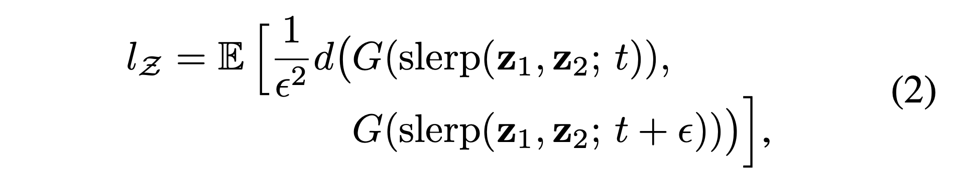 latent code에 대해서는 구형 선형보간을 적용합니다. (normalized input latent space에서는 구형 선형보간이 적절하다.)