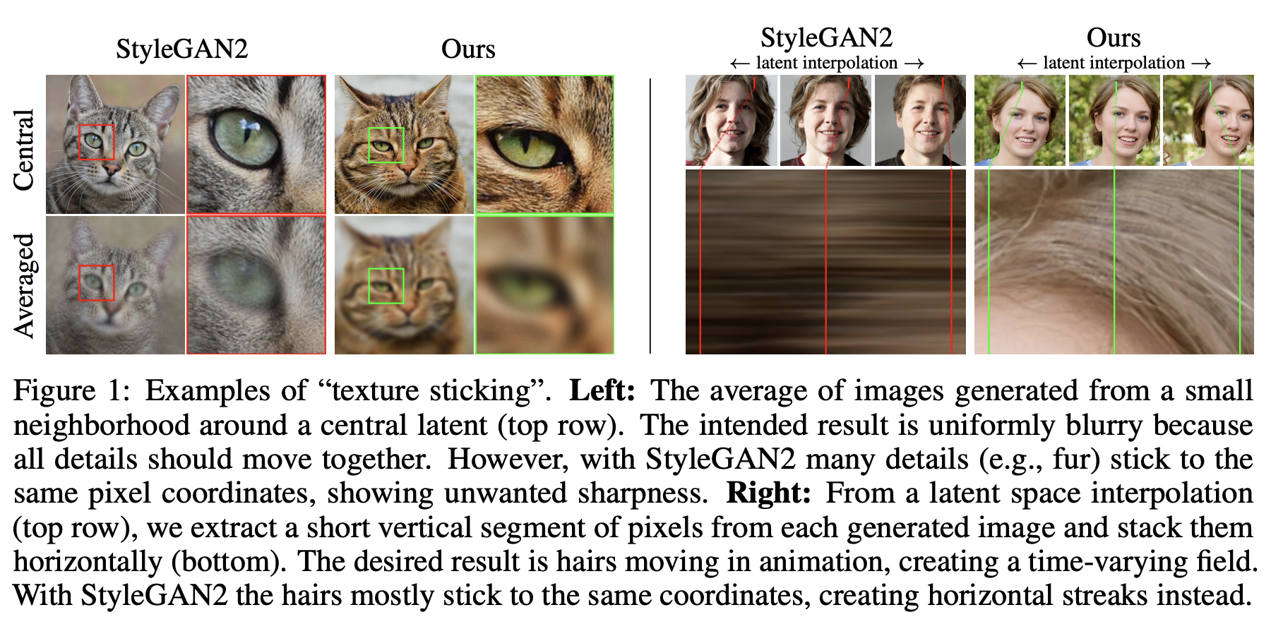 왼쪽 고양이 사진을 보면 StyleGAN2의 경우 눈 주위 털의 결과 같은 texture가 고정되어 있음을 알 수 있습니다.