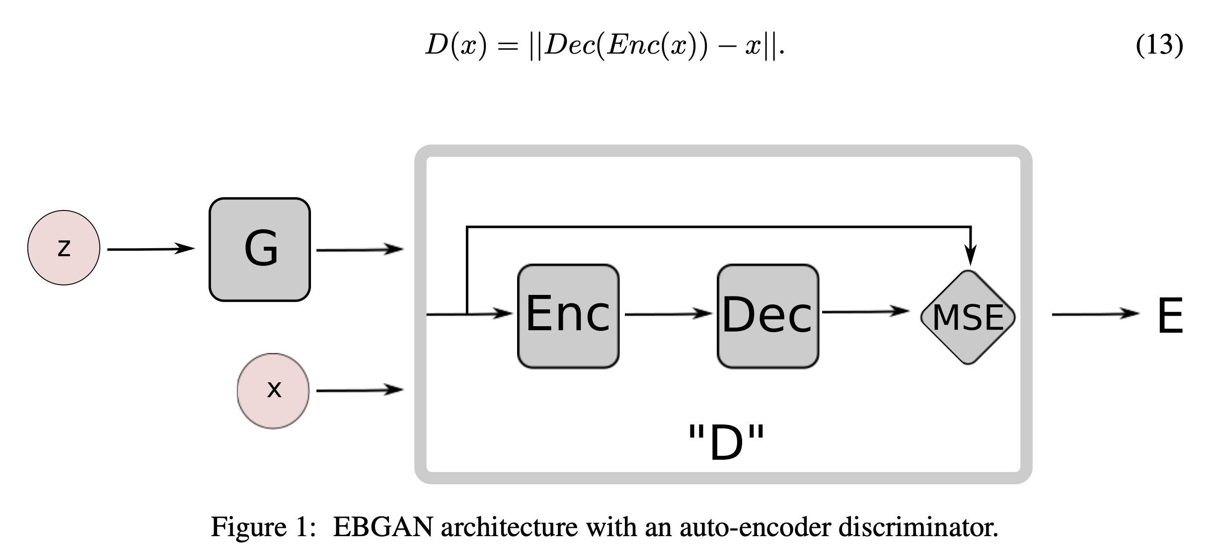 이와 같은 Energy Function 역할을 하는 Discriminator를 구성하기 위해 MSE Loss 를 내놓는 Auto Encoder 구조를 제안합니다. (real data에 가까우면 낮은 MSE 를 내놓음. -> reconstruction을 잘하는!)
