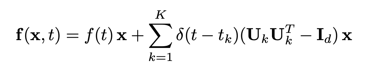 즉, 위 \(f(x,t)\) 식 중, 마지막 부분인 \((U_kU_k^T - I_d)\)를 \(-(I_d - U_kU_k^T)\)로 본다면, k-th subspace의 complement에 해당하는 요소를 뺀다고 생각할 수 있습니다.