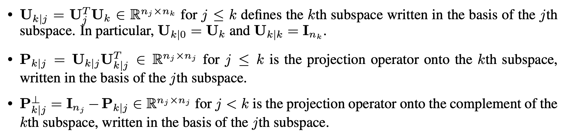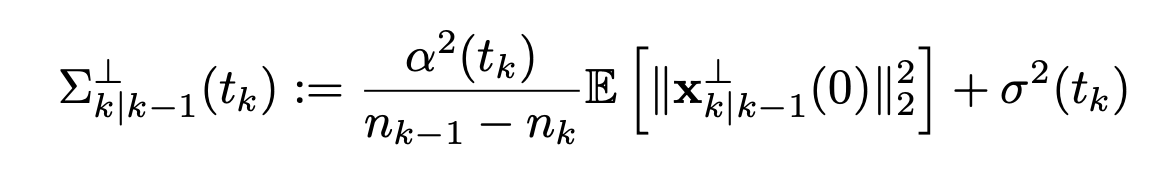 위 알고리즘에서 유의해서 봐야할 점은, \(P^\bot_{k|k-1}\)의 등장입니다. 본 operator는 kth subspace에 직교하는 공간에 투영하게 하는 projection operator를 k-1th subspace의 basis로 표현한 것입니다. 즉, 단순히, gaussian noise를 추출하게 되면 \(R^{n_{k-1}}\)의 모든 공간에 대해 정보를 갖게 되는데 이 정보들을 kth subspace에 직교하는 공간에 모두 투영시키는 것을 의미합니다. (k-1 th subspace basis로 표현됨.)