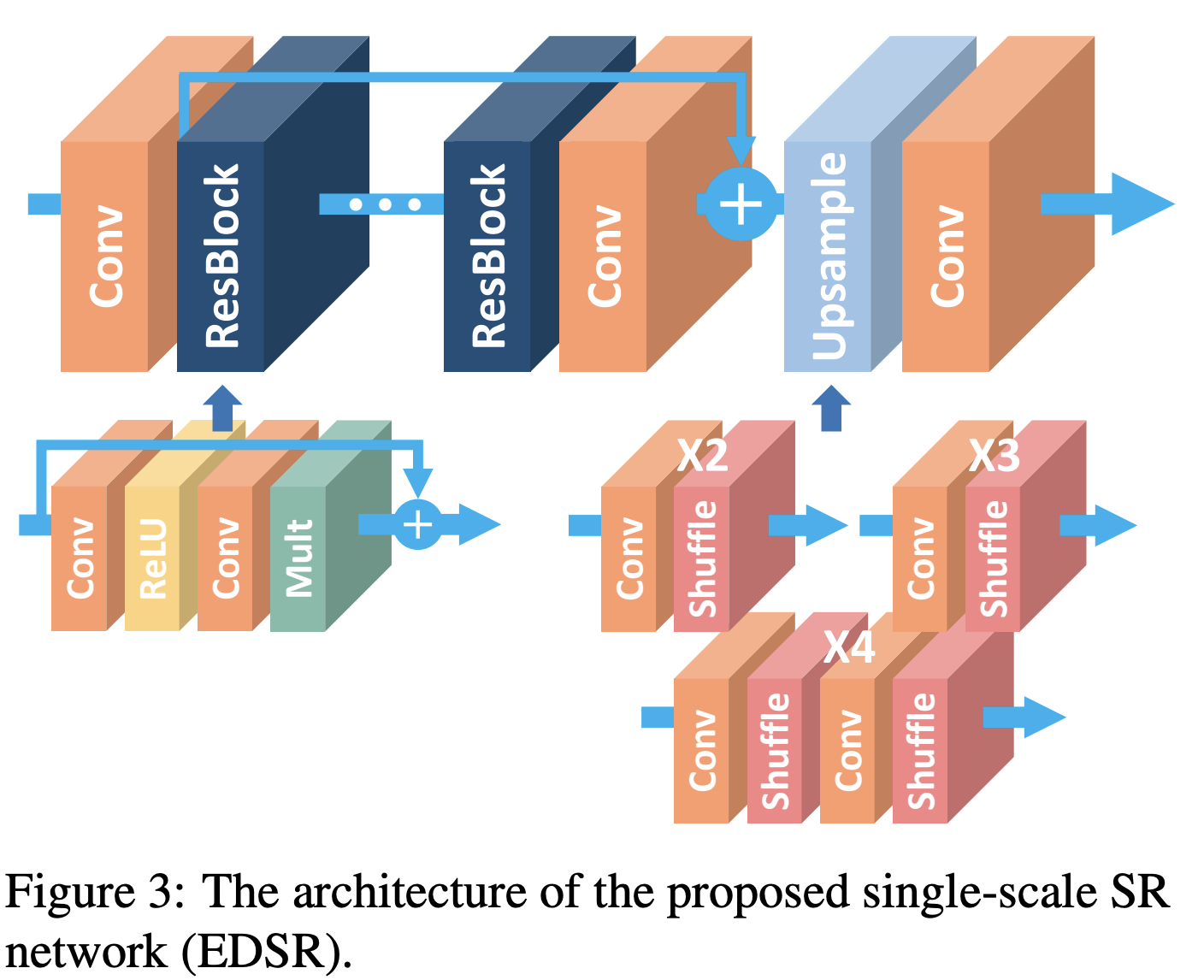 논문에서는 EDSR(enhanced deep super-resolution network), MDSR(multi-scale deep super-resolution network)을 소개 할 것입니다. 이 architecture들은 기존에 발표된 convolution residual network(SRResNet)에서 불필요한 부분을 제거하여 성능을 올렸습니다.
