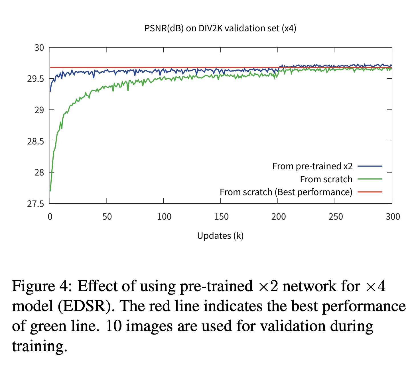 model에서 x3 scale, x4 scale에 대해 훈련 시킬 때 x2 scale에 대해 pretrain된 network의 파라미터로 초기화 시키고 훈련 시켜 보면, 아래와 같은 결과가 나옵니다.